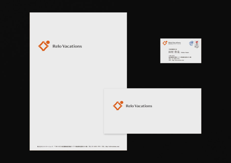 全国40施設、会員数30万人の会員制ホテル事業と、ホテル再生事業を行う「Relo Vacations」の新VIを担当しました。事業の中心は「人(社員・お客様・インバウンド)」と「循環(再生・地方創生)」であることをヒアリング。VIはRelo Vacationsの頭文字「R」と「V」を上下に組み合わせ、「人」をシンボライズ。上下に配置した「R」と「V」で形成し、対峙したように見える「人」は、会社と従業員、お客様とスタッフ、都市と自然、活動と休息など、異なる2つの概念と共存を象徴しています。また右上の楕円は山陰に陽が落ちる様子にも見え、日本らしい情緒的な風景を想起させます。併せてキーカラーは「暖かみ・親しみ・発展・幸福・健康」を感じさせるオレンジに設定。元々あった潜在する価値を可視化したVIです。