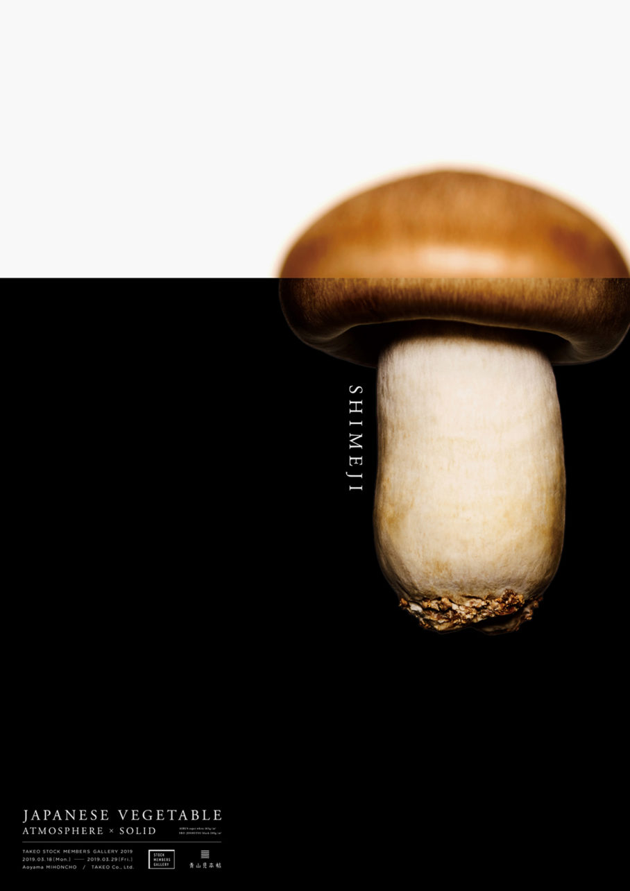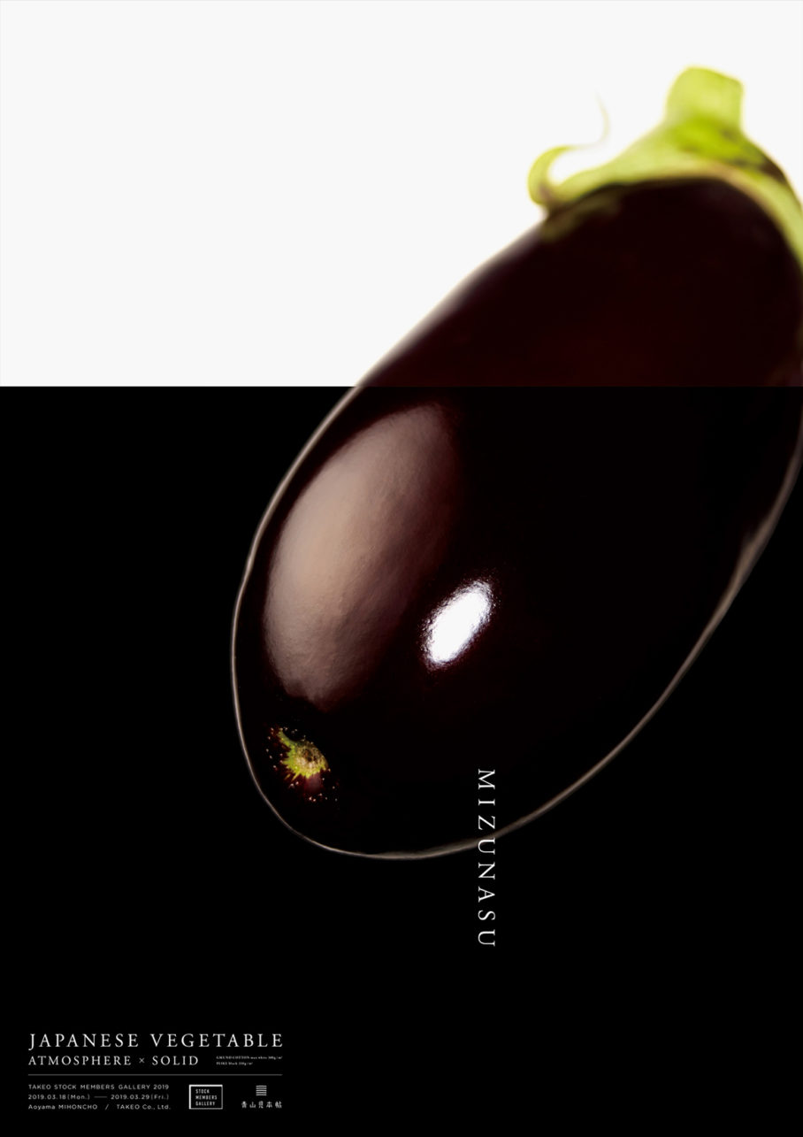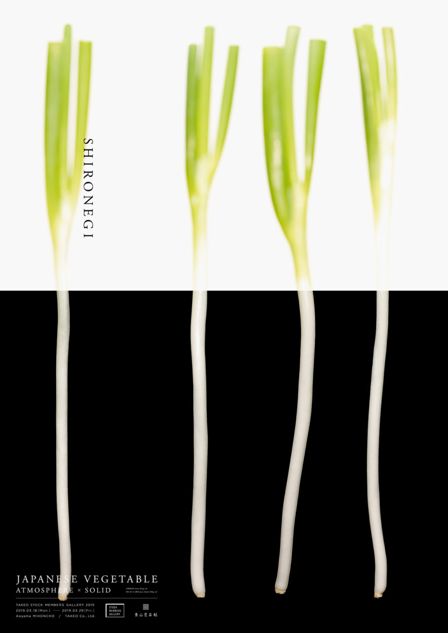 竹尾・青山見本帖にて開催された「TAKEO STOCK MEMBERS GALLERY2019」のための作品「JAPANESE VEGETABLE - ATOMOSPHERE×SOLID」。日本の野菜をモチーフに、紙の特性である柔かさ、その対極である硬さを、写真を用いて一枚のビジュアルに落とし込んだポスターです。それぞれの野菜に対して、異なる8種の白と黒の用紙を選定し、どのような印刷効果があるかを知る実験的な作品です。