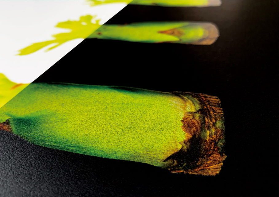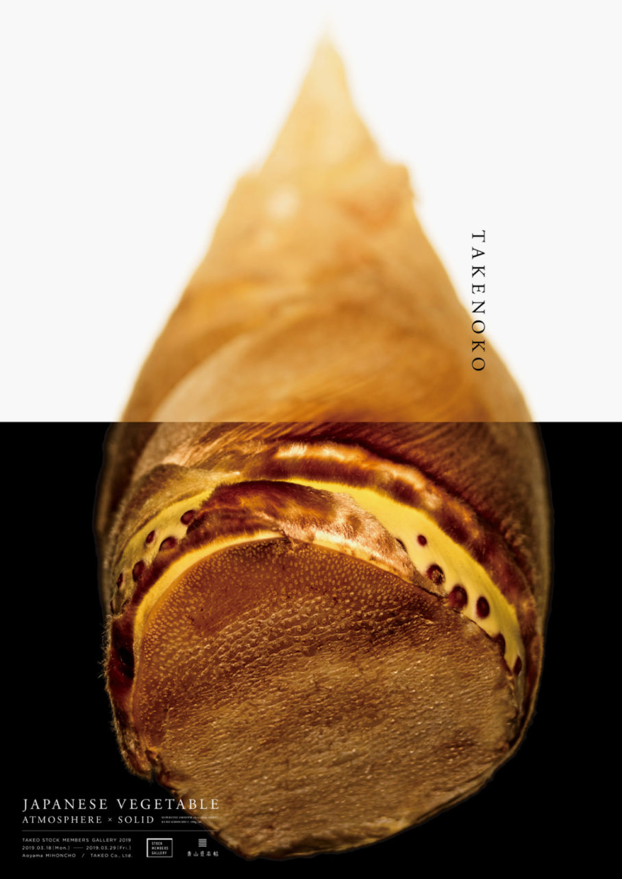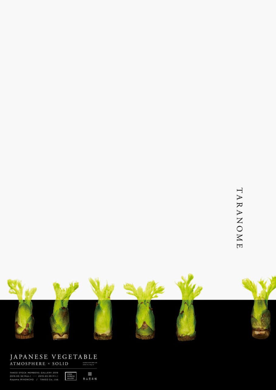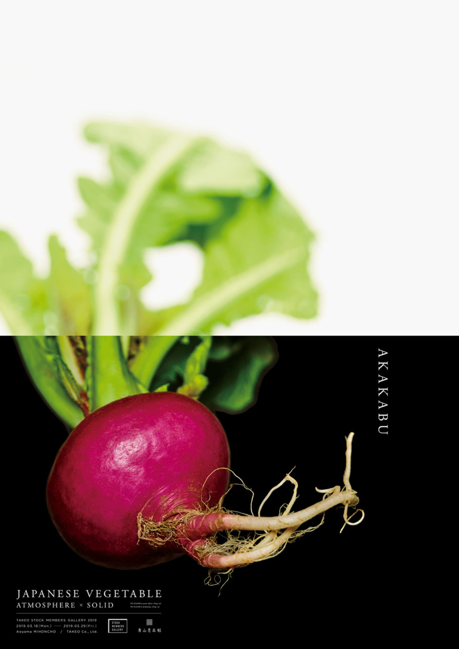 竹尾・青山見本帖にて開催された「TAKEO STOCK MEMBERS GALLERY2019」のための作品「JAPANESE VEGETABLE - ATOMOSPHERE×SOLID」。日本の野菜をモチーフに、紙の特性である柔かさ、その対極である硬さを、写真を用いて一枚のビジュアルに落とし込んだポスターです。それぞれの野菜に対して、異なる8種の白と黒の用紙を選定し、どのような印刷効果があるかを知る実験的な作品です。