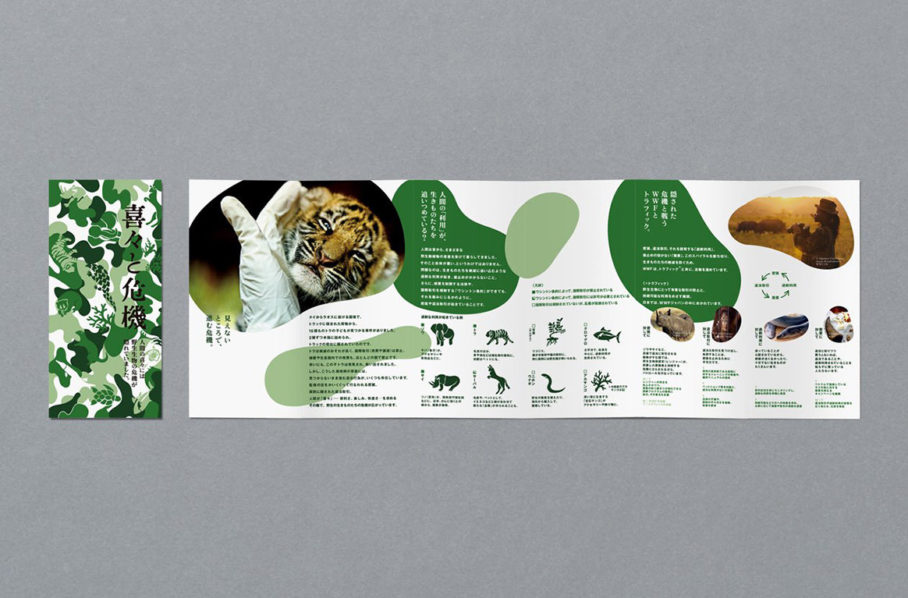「WWFドネーションキャンペーン」のアートディレクションを担当しました。ドネーションキャンペーンとは、野生生物および森林・海洋生態系の保全、地球温暖化防止など、WWFジャパンの活動全般に寄付・支援を募る活動です。各回ごとに絶滅危惧種の野生動物や地球問題のテーマが設定され、ヒアリング・理解することから取り組み、リーフレットや返礼品としてグッズをデザインしました。結果としても、寄付金が何に還元されたかが数字で分かる、実りあるプロジェクトです。