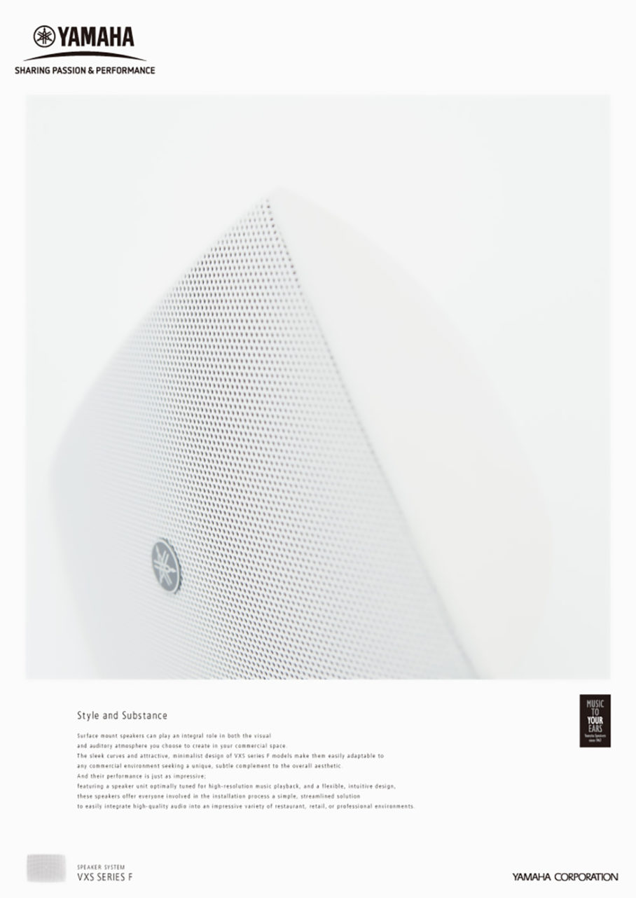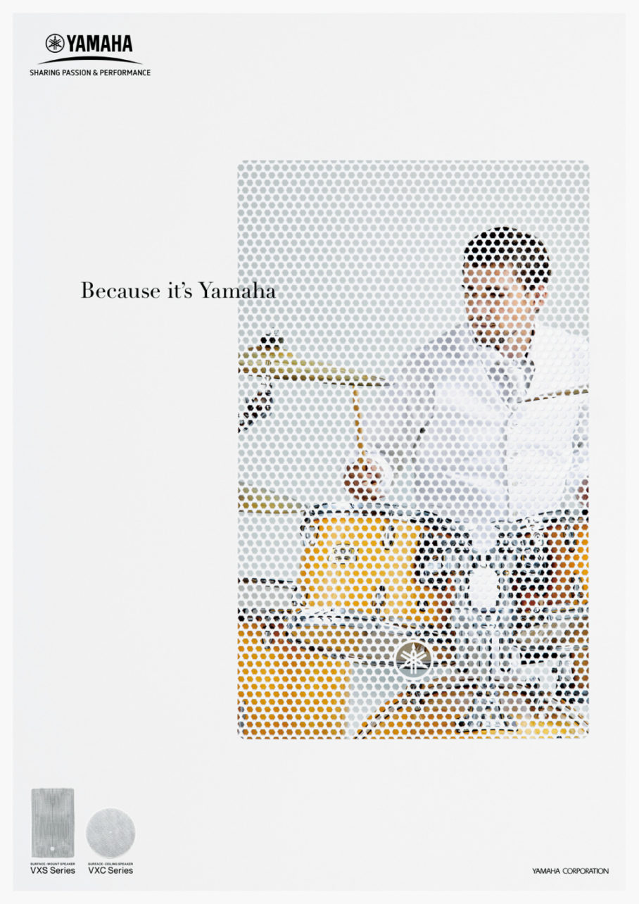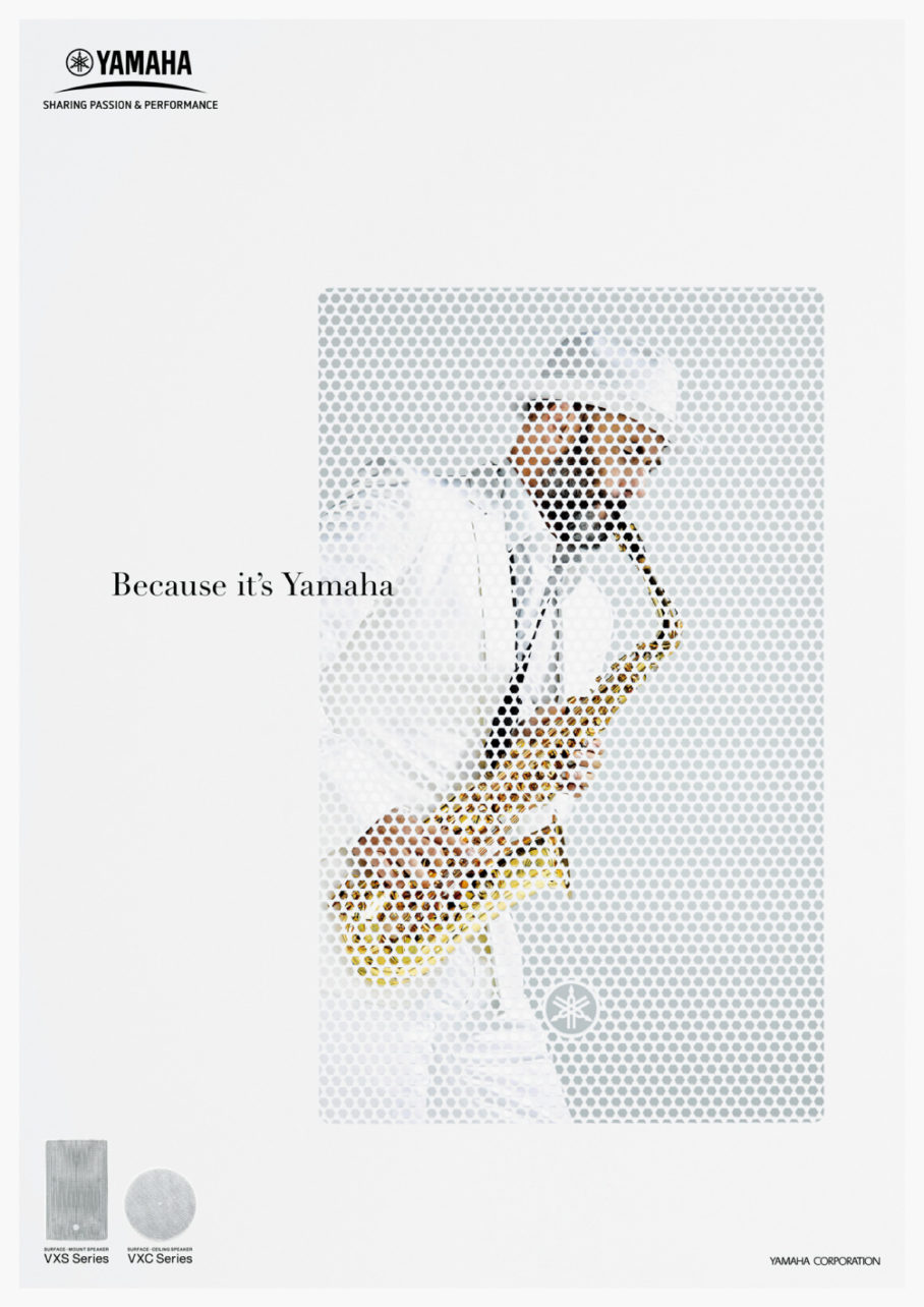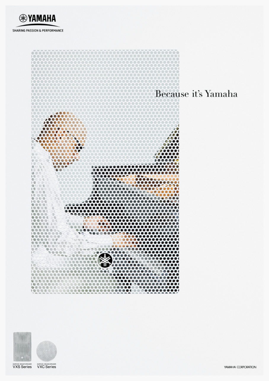 ヤマハ「CISスピーカー」キービジュアルのアートディレクションを担当しました。原音再生という高解像度の音を届け、空間にも溶け込むスピーカーという特徴から、シリーズ毎にビジュアルを制作。第一弾では、スピー型に切り取ったパネル越しに奏者を撮影し「原音再生」を可視化。第二弾では、プロダクトの形状が分かる限界を狙い接写し「空間に溶けむ」クリーンで繊細なスピーカーであることを表現しました。